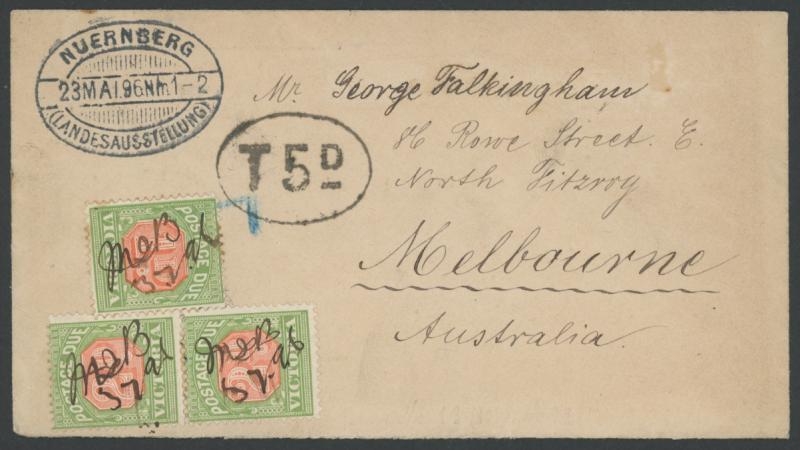 1896 (May 23) stampless envelope from Bavaria with very fine strike of double-oval 'NUERNBERG/ (LANDESAUSSTELLUNG)' [= State Exposition] datestamp at upper left, taxed on arrival with Melbourne 'T 5 D' oval handstamp on the face and Postage Dues 1d & 2d vertical pair affixed alongside with pen cancels, 'FITZROY NORTH/VIC - 828' duplex cancel arrival on reverse, a couple of very minor blemishes. Gorgeous. The Exhibition datestamp may have served as a 'Frank Stamp' on official mail from the event, but was not valid to pay international postage. (Image1)