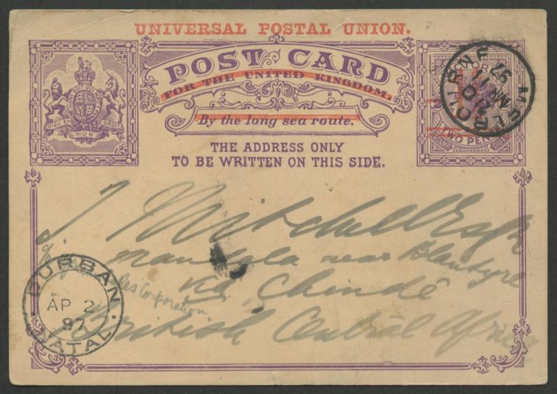 1897 (Nov 11) usage of '1½d' on 2d Postal Card to "Mandala near Blantyre via Chinde, British Central Africa" with Melbourne cds cancel, largely very fine transits of 'DURBAN/AP 2/NATAL' on the face and 'CHINDE/AP 16/97/BCA' & 'BLANTYRE/11 MY/97/BCA' on the reverse, a couple of minor transmission marks. A wonderful destination, enhanced by the lengthy social message & transit markings. (Image1)