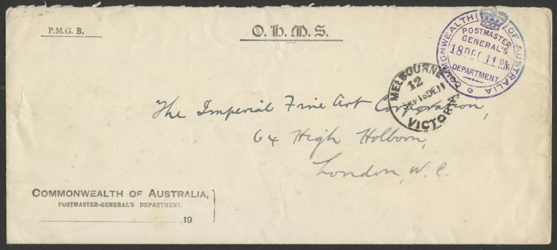 1909-11 Postmaster General's Department long-format envelopes used locally (one to GB) with various crowned dated 'frank' cachets comprising crowned double-oval in red, triple-oval in green and crowned circle in violet x2; plus 1922 to GB with double-oval in violet with 'OFFICIAL PAID' handstamp; condition a little mixed one a front only.