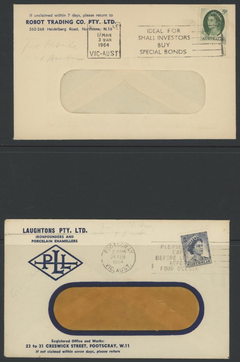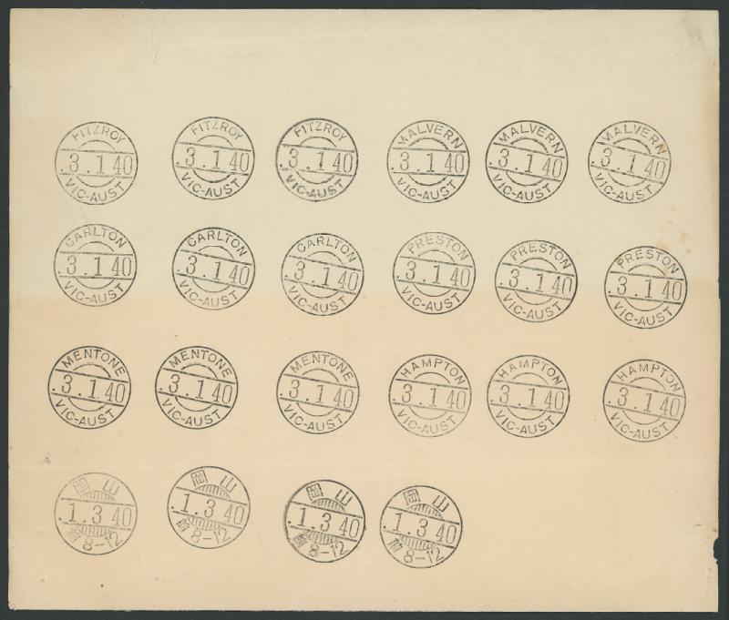 1966 page from the contractor's records with four strikes of a Japanese-pattern cds plus three proof impressions of each of six 24mm experimental cds derived from the Japanese pattern for Carlton, Fitzroy, Hampton, Malvern, Mentone & Preston, plus usage of the 'PRESTON' cds on a commercial registered cover, and 1966 registered cover with a 25mm US- or Canadian-pattern 'hammer' inscribed 'PRAHRAN S.1'. A rare & desirable group. Postal usage has been recorded of all but the Hampton & Mentone cds, but it is expected they were also issued. Ex Horton's Hoard.