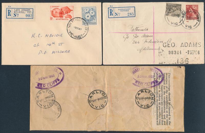 Bundles of covers including a batch from Manangatang some with instructional handstamps, 1955 Tatts registered from 'BARRAPOORT', 1963-73 John Webster registereds from '14TH STREET MILDURA', 'ARMSTRONG'S', 'BROWNS PLAINS', 'CASHMORE', 'CANNIE', 'CHETWYND' and 'CLARENDON', also 'RELIEF/ 7MY54/No15' with "Mildura/Mil PO" on blank R label, 1950 with 'BOLTON/VIC-AUST' on the face, 1933 with triple-oval 'MONEY ORDER OFFICE/RED CLIFFS' backstamp (the only recorded example), airmail covers with 2/- or 2/3d solo frankings, and a bundle of 2000s airmail covers to GB with an array of International Stamps including a few scarcer frankings.