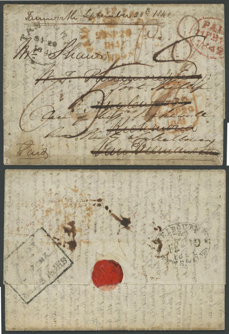 1842 (Sept 29) entire letter from Great Britain to "Anglewood, Richmond, Van Diemens Land" endorsed "P 8"[d] & "Paid" with largely fine 'TAMWORTH' unframed despatch cds in black and London 'PAID' tombstone & 'PAID SHIP LETTER' crowned oval datestamps both in red on the face, light Hobart 'SHIP LETTER/28JA28/1842' boxed arrival datestamp in black on the reverse, re-directed to 'River Plenty nr Melbourne, Port Phillip" with very fine large-part Hobart 'PAID/11FE11/1842' oval datestamp on the face rated "6"[d] and similar complete 'MELBOURNE/FE*19/1842/NSW S. WALES' framed crowned-oval datestamp on the reverse where rated "5"[d], minor blemishes & aging marks. Carried by 'Sydney' to Hobart and by 'Caroline' departing Hobart 11.2.1842 to Melbourne. The rate was GB 8d ship letter, Tasmania 6d Inter-Colonial ship letter and Victoria 3d inwards ship letter plus 2d inland delivery. Ex John Barwis. (Image1)