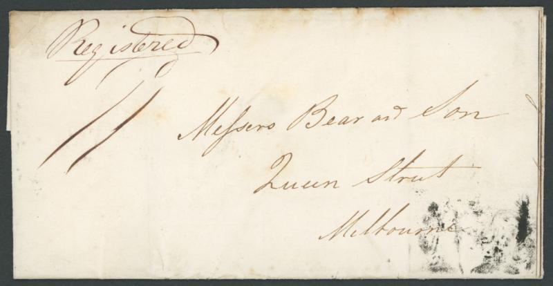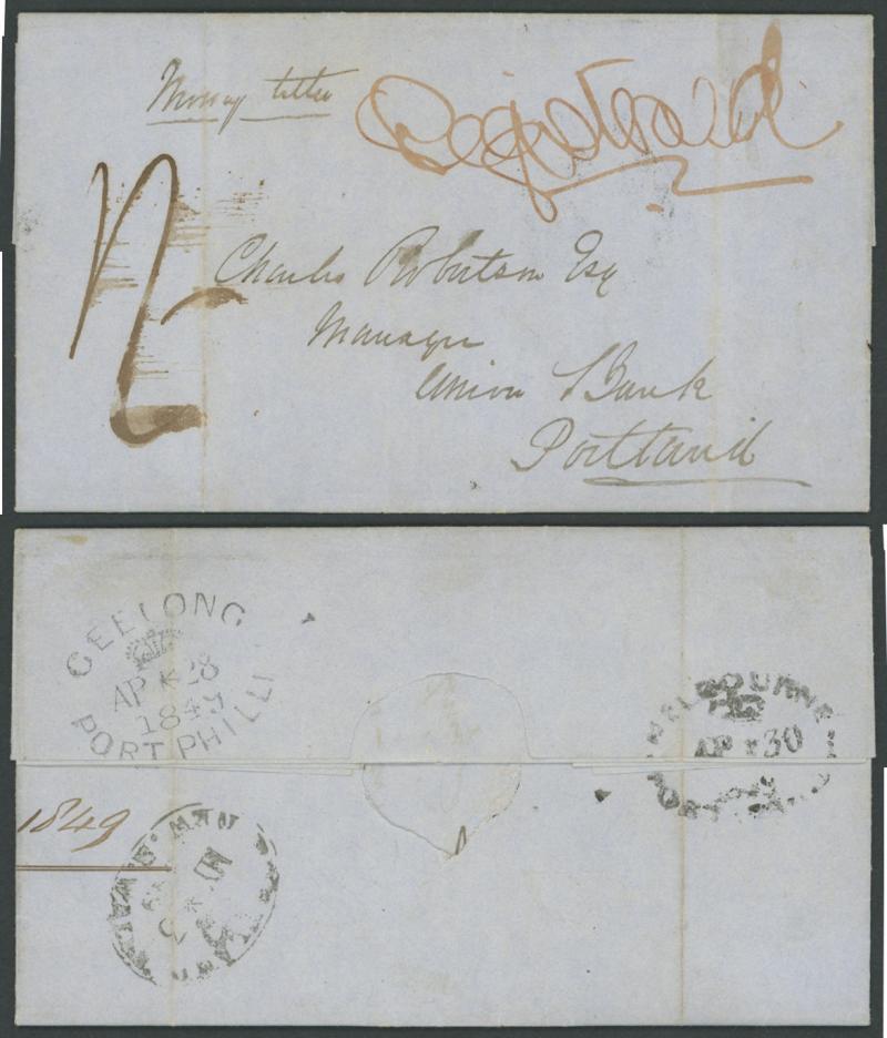 1849 (April 28) entire headed 'Geelong' signed 'James Whyte', to 'Charles Robertsopn Esq, Manager, Union Bank, Portland' endorsed 'Money letter' (the Tasmanian terminology) with 'Registered' (the Victorian term) added later in red, rated '1/-' in black for carriage between 230 & 300 miles, very fine complete 'GEELONG/PORT PHILLIP' unframed crowned oval despatch, 'MELBOURNE/PORT PHILLIP' unframed crowned oval transit and fair 'PORTLAND/NEW.S.WALES' framed crowned oval arrival all on the reverse, two light vertical folds slightly affecting the markings. A striking item: illustrated in 'Philately from Australia' March 1998 at p6. James Whyte was a prominent pastoralist who arrived in Tasmania in 1832. He lived in Victoria between 1837 & 1852, developing stations at Coleraine & Clunes, where gold was discovered on his property. After his return to Tasmania he served as Premier 1863-1866. Ex Max Watson, Brian Peace, Kevin Burt - sold at our auction of 7.2.2012 for $1940 (Sale 177 Lot 778) - and John Barwis. (Image1)