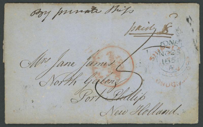 1851 (Nov 23) inwards entire from Great Britain unusually addressed to "Mrs Jane James, North Geelong, Port Phillip, New Holland" endorsed "By private ship" and "Paid 8d" with largely very fine 'LYDNEY' unframed cds in blue and London 'PAID' & SHIP LETTER' transits all on the face, on arrival rated '5'[d] to pay on the face with largely very fine 'MELBOURNE/1*AP/SHIP LETTER' crowned-oval in red and 'GEELONG' crowned-oval in black of the same day on the reverse, minor blemishes & light aging marks. The rate was Great Britain 8d ship letter prepaid and Victoria 3d inwards ship letter plus 2d inland delivery. The name 'New Holland' was widely used until the early 19th century, but thereafter generally replaced by 'Australia'; the Port Phillip District had been renamed 'Victoria' on 1.7.1851. Ex John Barwis. (Image1)