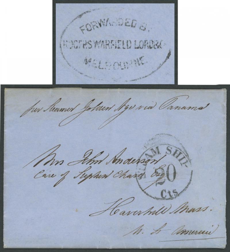 1852 (April 17) entire headed "Duplicate ... Melbourne Apl 17 54" to Haverhill, Massachusetts, USA endorsed "per Steamer Golden Age via Panama" carried per favor with fine oval 'FORWARDED BY/ROGERS WARFIELD LORD &c/MELBOURNE' handstamp on the flap (only one other example recorded), very fine New York 'STEAM SHIP/20/Cts' handstamp on the face, minor restored blemishes. The letter signed "John Anderson" to his wife includes "... I am about leaving ... tired of this Place and of the Proceedings [?] in it ...". Carried by the 'Golden Age' departing Melbourne 5.5.1854 via Tahiti to Panama City arriving 19.6.1854; by mule & canoe across the isthmus to Aspinwall (later Colon), then per US Mail Steamship Co to New York. This voyage was the only trans-Pacific contract mail service before 1866. The ship carried US$200,000 worth of gold dust, but consumed so much coal that the costs were ruinous, and the experiment was not repeated. Ex Dale Forster - sold at our auction of 21.5.2024 for $900 (Sale 256 Lot 1143) before being professionally cleaned - and John Barwis. (Image1)