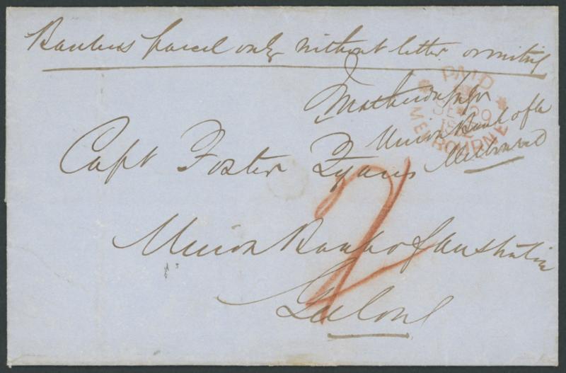 1852 (Sept 29) outer with rare endorsement "Bankers parcel only without letter or writing/J Matheson Mgr/ Union Bank of A/Melbourne", to Geelong rated "1" but corrected to "2" in red pencil with very fine 'PAID/MELBOURNE' crowned oval datestamp in red on the face and superb Geelong crowned oval arrival backstamp of the next day, a couple of very minor blemishes otherwise remarkably fine. The earliest Printed Matter item known to us. The 2d concessional rate was for Printed Matter up to 4oz. Ex Max Watson & John Barwis: sold at our auction of 28.6.2023 for $360 (Sale 252 Lot 182). (Image1)