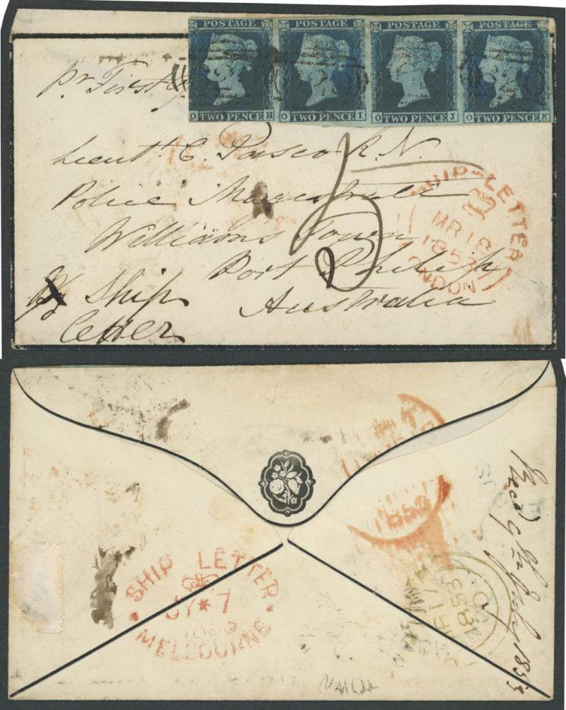 1853 (April 17) mourning envelope inwards from Great Britain to "Lieut C Pasco RN, Police Magistrate, Williams Town, Port Phillip" with QV Line Engaved 2d blue White Lines Added imperforate strip of 4 'OH-OK' (the left-hand unit cut-into at left & base, the others with margins close to large) tied by four fine to very fine strikes of Barred Numeral '620' cancels with light but identifiable 'STONEHOUSE' unframed cds in blue despatch overtruck by similar 'PLYMOUTH' unframed cds in black, London 'SHIP-LETTER' crowned cds in red, largely very fine 'SHIP LETTER/JY*7/1853/MELBOURNE' crowned oval transit in red where rated '5'[d] in black on the face, and light but identifiable 'WILLIAMS TOWN/JY*9/[....]/[....]IA' crowned oval arrival in black, all except the London marking on the reverse, minor blemishes & small adhesion on reverse clear of the markings. The rate was Great Britain 8d ship letter and Victoria 3d inwards ship letter plus 2d inland delivery. Sent by Admiral John Pasco to his son; as a Lieutenant, John Pasco had served with Admiral Nelson as Signal Officer on board 'HMS Victory' at the Battle of Trafalgar in 1805; he died less than six months after this letter was sent, on 16.11.1853. Port Phillip District was renamed 'Victoria' on 1.7.1851. Ex John Barwis. (Image1)