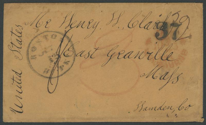 1853 (July 23) envelope to "Mr Henry H Clark, East Granville, Hamden Co, Mass"[achusetts], USA with Melbourne 'PAID' crowned oval datestamp in red and rated "3"[d] in red pencil for the prepaid outgoing ship letter rate only, London '29SE29/1853' transit backstamp in red where rated "8"[d] in black on the face for the Trans-Atlantic Packet rate, fair 'BOSTON/OCT/15/BR PKT' [British Packet] transit cds on the face where rated "32"[cents] in manuscript overstruck with bold '37' handstamp also overstriking the Melbourne datestamp, minor blemishes. Carried by 'Marlborough' departing Melbourne 2.7.1853 to Liverpool and Cunard 'Canada' departing Liverpool 1.10.1853. Ben Palmer Census #9. Ex Dale Forster & John Barwis. (Image1)
