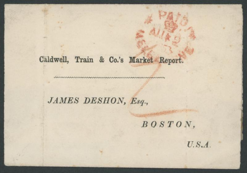 1853 (Aug 2) Caldwell, Train & Co.'s Market Report outer to Boston, USA with largely fine 'PAID/MELBOURNE' crowned-oval datestamp in red where rated "2"[d] in red paid for the Newspaper (printed matter) charge, docketed "rcd Nov 18th" on the reverse, two light vertical folds. Carried by P&O steamers 'Chusan' departing Melbourne 3.8.1853 arriving Singapore 4.9.1853, then 'Malta' departing Singapore 17.9.1853 to Galle, Ceylon, 'Madras' to Suez, overland to Alexandria and 'Euxine' to Southampton arriving 2.11.1853, then by Cunard Line Trans-Atlantic Steamer 'Arabia' to New York arriving 17.11.1853. This was the last P&O voyage via the Singapore branch line (presumably due to the poor connection), later voyages under this contract going directly to Galle. Scarce printed matter rate material carried by P&O before their service was suspended due to steamers being requisitioned for the Crimean War. Ex Dale Forster & John Barwis. (Image1)