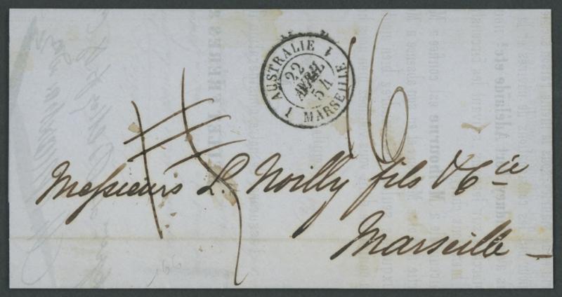 1853 (Nov 11) Bellet Freres & Cie partly-printed flimsy entire headed "Melbourne, 11 Novembre 1853" with added "PS" all in French, to Marseilles without any Victorian postal markings, put into the mails in France with very fine 'AUSTRALIE/22/AVRIL/54/MARSEILLE' cds on the face where originally rated "15"[centimes] inland delivery charge, crossed-out and re-rated "16", docketed as received from Melbourne on the inside, a few minor aging marks at the edges not visible from the face. Presumably carried by private ship as a consignee letter. Ex John Barwis. (Image1)