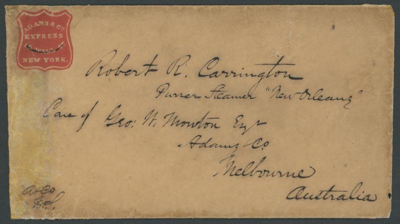 1854 (April) buff envelope with 'ADAMS & CO./EXPRESS/16 WALL ST/NEW YORK' embossed cameo shield in red at upper-left (the street address crossed out), addressed to "Robert R Carrington, Purser Steamer 'New Orleans', Care of Geo. W. Thornton Esqr, Adams & Co, Melbourne, Australia" with note on inside flap "Apl 30th - Dear Bob, I can only add to this dupl 'All well'. I am hurried very much today, and as this is not going by a clipper I let her slide, and will write fully by the next. John" and sender's notation "A&Co Pd" at lower-left, repaired edge faults & some aging. Carried by the barque 'Nimrod' departing New York 1.5.1854 via Rio de Janeiro to Melbourne arriving 17.9.1854. Adams & Co was an American firm that had overseas branches including in Melbourne; rare inwards item carried privately outside the mails. Ex John Barwis. (Image1)