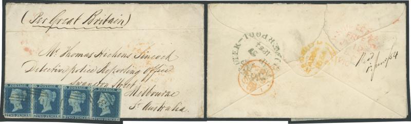 1854 (April 24) envelope inwards from Great Britain to "Mr Thomas Hichens Sincock, Detective Police Reporting Office, Swanston Street, Melbourne" endorsed "Per Great Britain" with QV Line Engaved 2d blue White Lines Added imperforate strip of 4 'RG-RJ' (the outside units cut-into at base, the other margins close to large) tied by four fine to very fine strikes of Barred Numeral '636' cancels with identifiable 'REDRUTH' unframed cds in red despatch, London cds in red and Liverpool 'SHIP LETTER' crowned cds in black transits, and largely fine complete Melbourne 'SHIP LETTER/FREE/JY 12/1854/G.P.O VICTORIA' arrival in red (earliest recorded date) all on the reverse, horizontal fold & closed edge tears clear of the adhesives & largely clear of the markings. Although endorsed per 'Great Britain', the item was carried by P&O 'Simla' departing Liverpool 27.4.1854 arriving Melbourne 12.7.1854. With the introduction of the 6d Uniform ship letter rate on 1.10.1854, additional inland rates were no longer charged. However, the 'FREE' marking indicates that the charging of inland rates was abolished earlier. Ex John Barwis. (Image1)