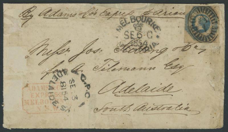 1854 (Sep 6) envelope front to Adelaide endorsed "By Adams Cos Express p Ariadne" and with a largely very fine strike of the rare 'ADAMS & CO/EXPRESS/MELBOURNE/N.S.W.' chamfered-boxed handstamp in red at lower-left, QV Octagonal 1/- blue (margins close to large) with very fine bold Barred Oval '1' cancel and largely very fine 'MELBOURNE/VICTORIA' unframed crowned-oval datestamp alongside, Adelaide GPO 'SE 13/1854' cds arrival on the face slightly overstriking the Adams & Co handstamp, repaired edge faults & some aging marks. RPSV Certificate (2010) states "carried outside the postal system to Melbourne then posted by Adams Express", but does not mention the faults. A very rare item handled by both a private express company and the Post Office. Ex Bill Hornadge, Michael Silvasich, an anonymous vendor - sold at our auction of 18.12.2010 for $2185 (Sale 161 Lot 474) and John Barwis. (Image1)