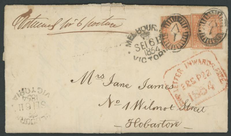 1854 (Sep 16) entire to "Hobarton" with QV Woodblocks 6d orange (margins good to large) tied by largely very fine Barred Oval '1' cancel and Melbourne crowned oval datestamp with time code 'B' alongside, endorsed "Detained for 6d postage" with a second QV Woodblocks 6d orange (margins in places) added partly across the datestamp tied by another very fine Barred Oval '1' cancel and a second strike of the Melbourne crowned oval datestamp with time code 'H' applied at lower-left, Launceston '21SP21/1854' cds (Hardinge Primitive (v); rated RRR) transit backstamp and a fine strike of the scarce 'SHIP LETTER INWARDS FREE/22SP22/1854' rounded-boxed datestamp in red on the face, light filing fold across the stamps and minor repaired edge faults. The Inter-Colonial ship letter rate was 6d per ½oz; this item weighed over ½oz and had to pay double rate. Sold at our auction of 20.9.2023 for $1320 (Sale 253 Lot 1577). Ex John Barwis. (Image1)
