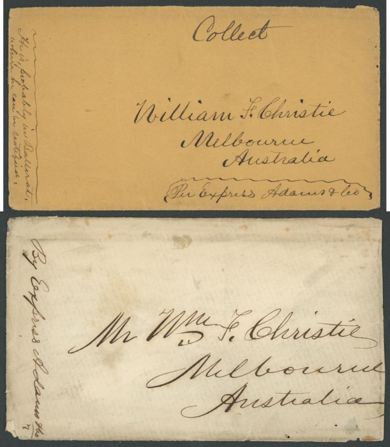 1854 (Sept 27) buff envelope enclosing lengthy 6pp letter headed "Albany" [New York, USA] from his sister to "William F Christie, Melbourne, Australia" with added note at left "He is probably in Ballarat, where he can be notified", endorsed "Per Express Adams & Co" & 'Collect" on the face; plus 1855 (Jan 30) envelope enclosing lengthy 3pp letter headed "Horse Heads Chimney Co, State of New York" to the same addressee from his brother endorsed "By Express Adams & Co" commencing "Since the receipt of yours of Sept 30/54 asking for aid to come home we have written you a number of letters ..." and going on to give details of the employee the family is sending to Melbourne to meet & assist his brother "... he sails the day after tomorrow on the ship Eastern State", both with a few minor edge faults, the latter with a few aging marks. Adams & Co was an American firm that had overseas branches including in Melbourne; the 'Eastern State' was an Adams & Co ship and presumably carried both the letter and the employee, departing New York 3.2.1855 arriving Melbourne 25.4.1855. Rare inwards items to the Victorian Goldfields carried privately outside the mails. Ex John Barwis.