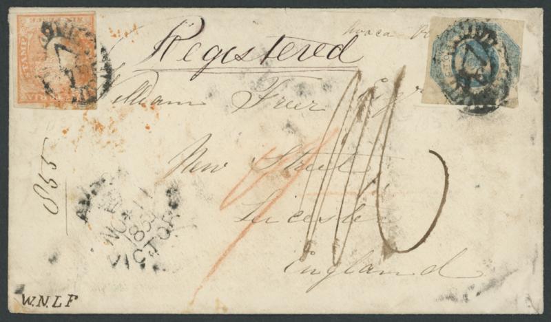 1854 (Nov 11) envelope to Leicestershire, England endorsed "Registered" with QV Woodblocks Imperforate 6d orange & Octagonal Imperforate 1/- blue (both with almost full margins, the latter with some surface faults) tied by slightly untidy Barred Oval '94' cancels (rated R) and fair 'AVOCA/VICTORIA' crowned-oval despatch datestamp at lower-left, Melbourne transit backstamp where taxed "1/-" in red pencil on the face for under-payment of the 1/- ship letter rate, London '12FE12/1855' transit alongside where rated "1/6d"[d] payable by addressee, minor closed tears on the back flap & some transmission marks. Carried by P&O steamers 'Norna' to Galle, Ceylon, 'Bombay' to Suez, overland to Alexandria and 'Tagus' to Southampton. On 1.10.1854, the 6d per ½oz Uniform ship letter 'paid to destination' rate was introduced between Great Britain and the Australian Colonies. However, Victoria had increased its outgoing ship letter rate from 3d to 1/- on 1.5.1854, and did not initially participate in the uniform rate. Great Britain introduced retaliatory rates, and the British PO clerks seem to have treated this item as wholly unpaid, charging the addressee 6d Uniform ship letter plus 1/- registration fee. Ex Les Molnar - sold at our auction of 7.12.2012 for $368 (Sale 177 Lot 783) and John Barwis. (Image1)