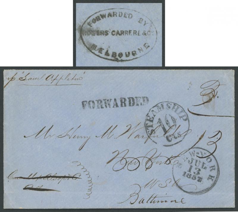 1857 (circa May) undated consignee's envelope to New York endorsed "p Saml Appleton" & "Care of Alsop & Co Callao" at lower-left with a largely very fine example of the rare 'FORWARDED BY/ROGERS CARRERE & Co/MELBOURNE' oval cachet on the back flap, New York 'STEAMSHIP/10/Cts' arrival on the face where re-addressed to Baltimore Maryland with 'JULY/13/1857' despatch datestamp and 'FORWARDED' handstamp also on the face, rated "3"[cents] domestic mail totalled to "13"[cents] including the inwards sheamship charge, no arrival markings, minor transmission marks. Carried by private ship across the Pacific to Callao Peru where the "Care of ..." endorsement crossed-out, then to Panama City, by rail to Aspinwall (later Colon; railway opened 28.1.1855), then ship to New York. Ex Dale Forster - sold in 2020 for US$662 where stated to be the only recorded example of this forwarder's cachet - and John Barwis. (Image1)
