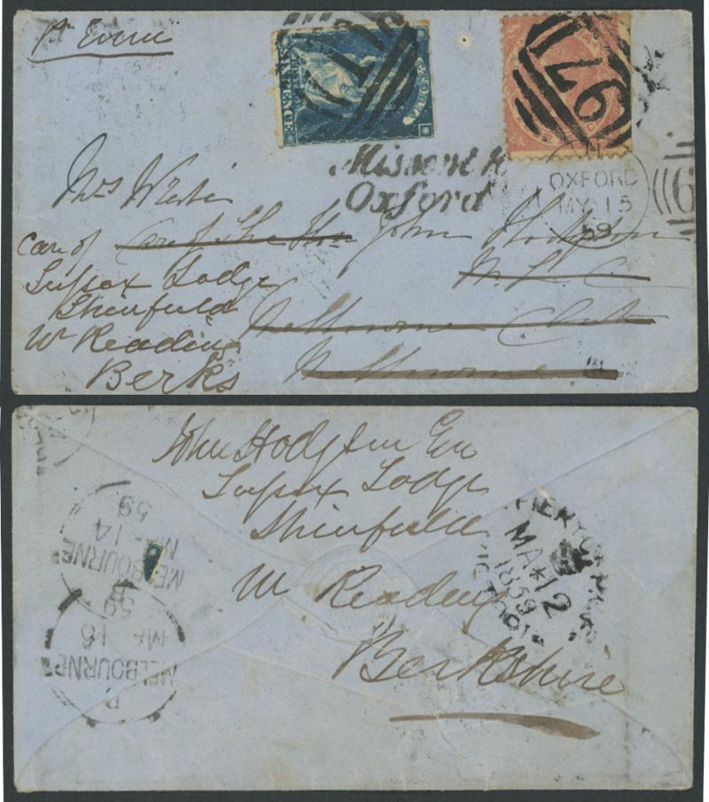 1859 (March 12) envelope to "Melbourne Club", Melbourne with QV Emblems 4d rose tied by largely very fine bold Barred Numeral '97' cancel and 'FIERY CK PGF/VICTORIA' [Pyrenees Gold Field] crowned-oval despatch backstamp, forwarded to "Suffolk Lodge, Shenfield, W Reading, Berks"[shire], England endorsed "p. Emue" with QV Queen-on-Throne Rouletted 6d blue affixed on the face tied by Barred Numeral '1' cancel and Melbourne 'MA 16/59' despatch backstamp, Oxford 'MY 15/59' duplex transit on the face where 'Missent to/Oxford' handstamp applied alongside and the forwarding address written out in full on the reverse, minor blemishes. Fiery Creek, Pyrenees Gold Field renamed from Fiery Creek (2) 1.1.1856; renamed Raglan (1) 16.5.1860 [Gold Mining]. Carried by P&O steamer 'Emeu' departing Melbourne 17.3.1859, breaking her shaft 1,000 miles out of King George's Sound and continuing to Port Louis under sail, transferred to 'Granada' at Mauritius and to 'Bengal' at Aden arriving Suez 4.5.1859, overland to Alexandria and 'Ellora' to Marseilles, the London mails arriving 15.5.1859. Ex John Barwis. (Image1)