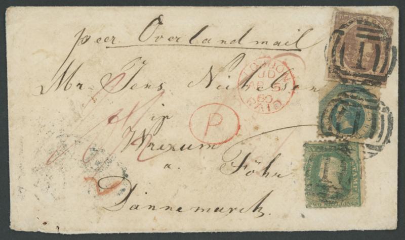 1860 (Feb 15) envelope to "Mr Jens Nichelsen, in Wrexum a Fohr, Danemark" endorsed "Per Overland Mail" with QV Emblems Rouletted 2d lilac, Octagonal 1/- blue (faults) & Woodblocks 2/- green tied by Barred Numeral '1' cancels with Melbourne small despatch backstamp, London 'AP 5/60/PAID' cds and 'P'-in-oval handstamp both in red on the face with "10½"[d] manuscript accountancy marking alongside, Danish 'KD PA HAMBURG/7/4' double-ring transit where rated "2" for inland delivery and fair 'WYCK/8/4/1860' arrival backstamps, minor edge faults & light aging. The rate was 1/10½d for ½oz or 3/9d for 1oz via Marseilles, but Ben Palmer gives 3/2d for the ½oz registered rate (p67), so apparently this item was intended to be sent registered (note that only 10½d credit for a ½oz letter was claimed by Great Britain). Carried by P&O steamers 'Salsette' to Suez, overland to Alexandria and 'Panther' to Marseilles arriving 3.4.1860, and onwards by train to the Royal Danish Postal Agency in Hamburg, Germany. Ex John Barwis.