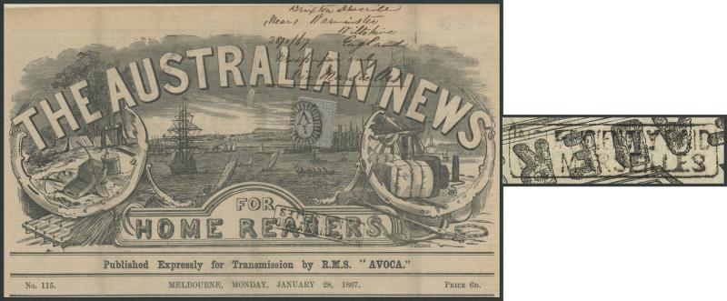1867 (Jan 28) 'The Australian News' with 'Trade & Commerce' banner & '.../The New Members of the Ministry' below (both unattributed), hand-addressed to Wiltshire "via Marseilles" per RMS 'Avoca' with Laureates 2d grey-violet tied by an irregular usage of the Barred Oval '1/V' of Melbourne, fine but partly-obscured strike of the boxed 'INSUFFICIENTLY PAID/VIA MARSEILLES' h/s (the only example we have seen on a non-standard article), removed from a bound volume & remarkably fine. Ex Dale Forster. An important & unusual rates item: Ben Palmer at page 264, notes that the standard newspaper rate via the Long Sea Route was 1d. He gives no rate via Marseilles but does quote an 1866 rate of 2d via Trieste. (Image1)