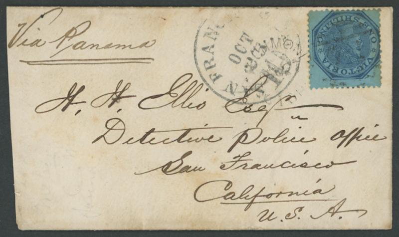 1867 (July 27) envelope to "HH Ellis & Esq, Detective Police Office, San Francisco", USA endorsed "via Panama" with QV Laureates 1/- blue/light blue solo tied by Richmond duplex cancel, Melbourne transit backstamp and 'SAN FRANCISCO CAL/OCT/25/ 10 ' arrival cds on the face for the 10c inland delivery fee, slightly trimmed at left and a few minor aging marks. Scarce routing: carried by Panama, New Zealand & Australian Royal Mail Co 'Mataura' departing Melbourne 28.8.1867 arriving Panama 4.10.1867, then by 'Constitution' to San Francisco. Not listed in Ben Palmer's Census. Sold at our auction of 7.12.2012 for $460 (Sale 177 Lot 815). Ex John Barwis. (Image1)