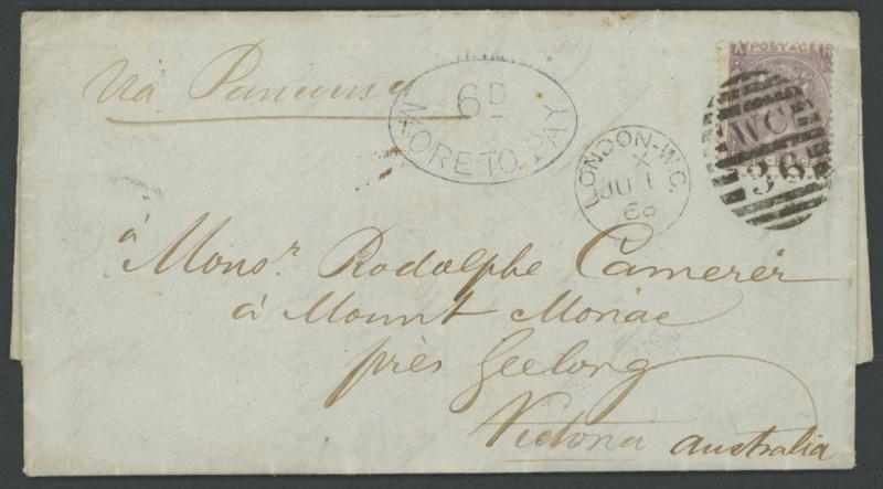 1868 (July 1) entire to "Messrs Rudolphe Camerer, a Mount Moriac pres Geelong, Victoria" (= at Mt Moriac near Geelong) with QV 6d tied by very fine London 'WC/36' duplex cancel, Melbourne cds arrival backstamp of 'AU3/68' in blue where very fine '6D/MORE TO PAY' handstamp also in blue applied on the face and Geelong unframed arrival of the same day on the reverse, light vertical fold clear of the adhesive & markings. Includes Union Bank of Australia (London) illustrated Letter of Credit 'DUPLICATE' for £90 payable at Geelong with GB Impressed Duty 'ONE/PENNY'. Scarce routing via Panama: carried by Panama New Zealand & Australian Royal Mail Packet 'Tasmania' via Jamaica, Panama & Wellington arriving Sydney 28.7.1868. The sender had paid only the 6d Uniform ship letter rate rather than the 1/- per ½oz 'via Panama' rate, hence the item was taxed. Ex John Barwis. (Image1)
