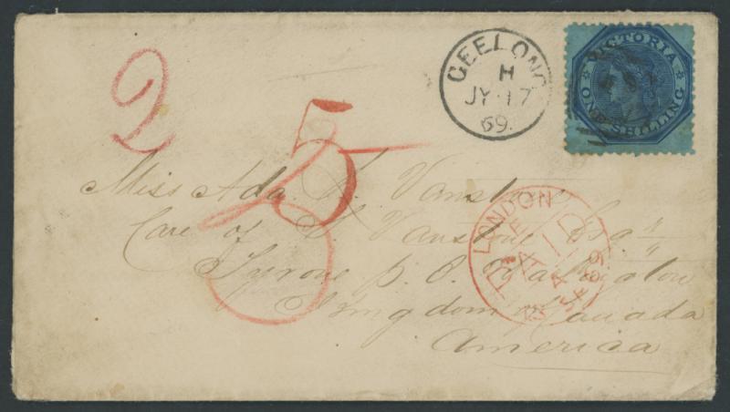 1869 (July 17) envelope to "Tyrone PO Darlington, Kingdom of Canada, America" with QV Laureates 1/- blue/light blue solo tied by Geelong duplex cancel, London 'PAID/13 SP 69' cds transit in red on the face and accountancy marking "2"[d] in red pencil for credit to Great Britain for Trans-Atlantic Steamer service alongside, on arrival rated "5"[c] inland delivery in red pencil manuscript overstruck with very fine '5' large numeral handstamp in red on the face, light partial Quebec 'SP 27/69' unframed cds transit and largely very fine 'BOWMANVILLE/SP 29/69/ONT' framed cds arrival backstamps, minor blemishes. The rate was 1/- per ½oz for carriage via Southampton. Not listed in Ben Palmer's Census. Ex John Barwis. (Image1)