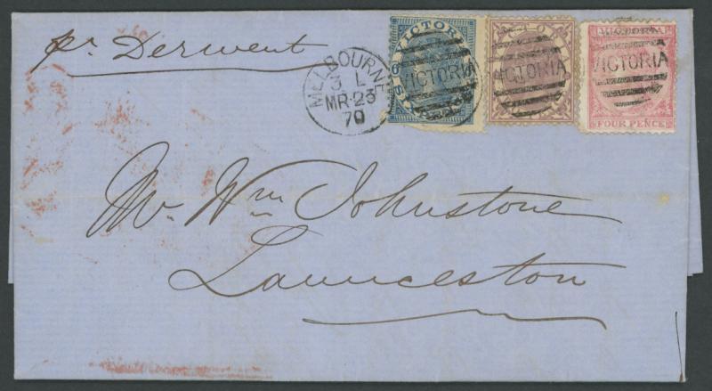 1870 (March 23) entire to Launceston, Tasmania endorsed "p Derwent" with QV De La Rue 2d violet and Laureates 4d rose & 6d blue (corner fault) tied by Melbourne duplex cancels, largely very fines Launceston 'SHIP LETTER INWARDS FREE/25MR25/1870' diamond arrival backstamp in red, light horizontal fold clear of the adhesives. The rate was double 6d per ½oz Inter-Colonial ship letter. Ex John Barwis. (Image1)