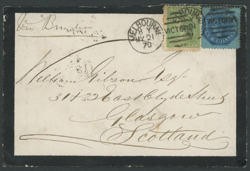 1870 (May 5) Richard Harvey Soda Water Manufacturers mourning envelope (logo on back flap) to Scotland endorsed "Via Brindisi" with QV Laureates 1d green & 1/- blue/light blue tied by Melbourne duplex cancels, Glasgow 'JY 9/70' arrival backstamp, a few edge faults & small part back flap missing. The 1/1d per ½oz 'emergency' rate to cover the cost of using Italian steamships in place of the Marseilles service (suspended due to the Franco-Prussian War) was only in place for one year, then reduced to 9d per ½oz from 23.1.1871. Carried by P&O steamers 'Avoca' to Galle, 'Simla' to Suez, overland to Alexandria and Adriatic & Oriental Line 'Brindisi' to Brindisi, the London mails arriving 8.7.1870. RSPV Certificate (2006). Ex JRW Purves, Ben Palmer & John Barwis. (Image1)