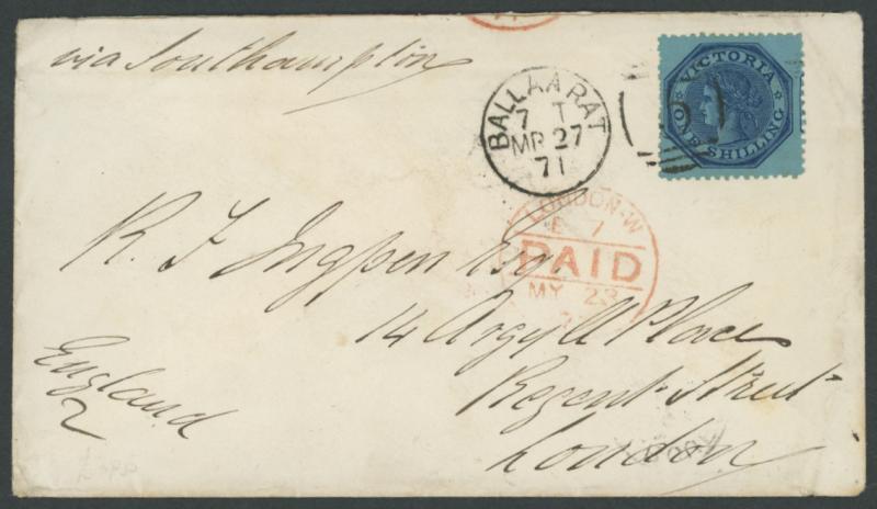1871 (May 27) Powers Rutherford & Co (Ballaarat) envelope to England "via Southampton" with QV Laureates 1/- blue/light blue solo tied by Ballarat, Vic duplex cancel, Melbourne transit backstamp of the next day, London 'PAID/MY 23/71' cds arrival in red on the face, a few minor transmission marks. Carried by P&O 'Geelong' departing Melbourne 28.3.1871 and 'Poonah' departing Galle, Ceylon 20.4.1871 on the first Australian mail to pass through the Suez Canal. The via Southampton rate was 6d per ½oz x2. Ex John Barwis. (Image1)