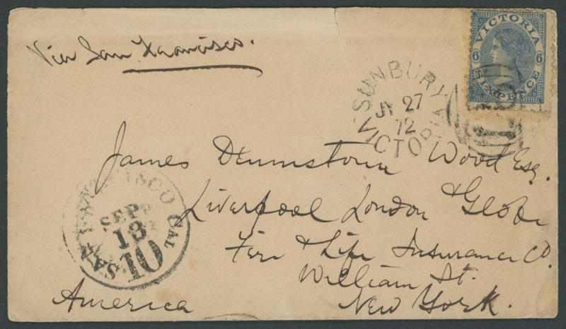 1872 (July 27) envelope to New York USA "via San Francisco" with QV Laureates 6d blue tied by fair Barred Numeral '178' with very fine 'SUNBURY/VICTORIA' unframed cds alongside, carried on Sandhurst (Bendigo)-Melbourne Line train with largely very fine vertical-oval 'UP/TRAVELLING/POST OFFICE/ VICTORIA/M.G.3' datestamp (Molnar rated R) to Melbourne with 'JY 29/72' transit backstamp, 'SAN FRANCISCO CAL/SEP/13/ 10 ' cds transit on the face for the 10c inland delivery fee, no arrival marking, light gum stains and a few edge faults clear of the adhesive & markings. Ex John Barwis. Carried by rail to Sydney, by Webb & Holladay Line contract route to San Francisco, and by trans-continental railway to the East Coast. The Webb & Holladay Line contract route operated -.3.1871 to -.5.1873 only; John Barwis records only nine covers from Victoria to the USA carried by this service. The rate was 6d per ½oz packet letter plus inland delivery charge. Not listed in Ben Palmer's Census. (Image1)