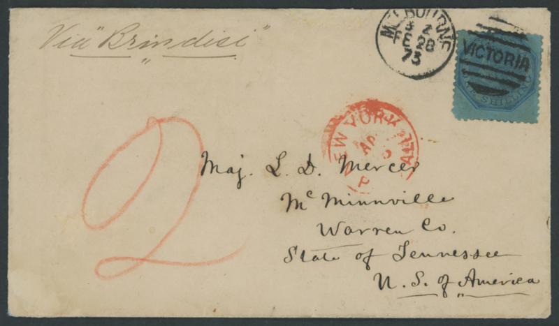 1873 (Feb 28) envelope to "Warren Co, State of Tennessee" USA "Via Brindisi" with QV Laureates 1/- blue/light blue tied by Melbourne duplex cancel, London accountancy marking "2"[d] in red pencil for credit to Great Britain for Trans-Atlantic Steamer service on the face and New York 'AP/[?]5/PAID ALL' cds in red alongside, apparently no charge raised for inland delivery, repaired edge faults and large-part back flap replaced. The rate was 1/- per ½oz for carriage via Southampton. Tennessee is one of the more difficult-to-find destinations for Australian mail: see also Lot 1829. Ben Palmer Census #236. Ex John Barwis. (Image1)