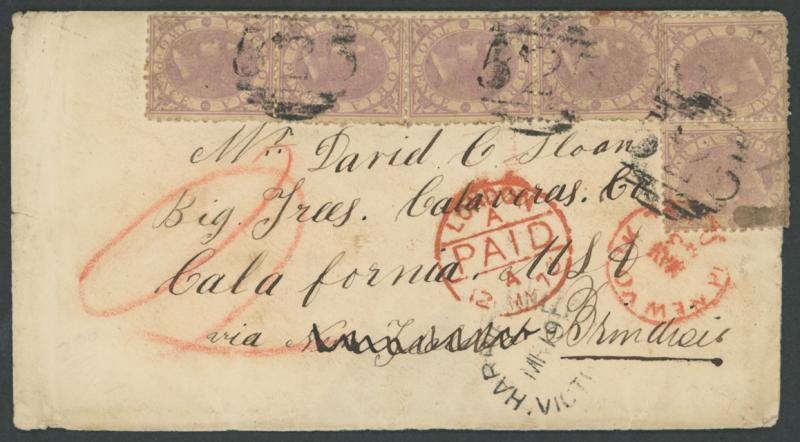 1873 (March 19) envelope to "Big Trees, Calaveras Co, California, USA" endorsed "Via New Zealand" but crossed out and replaced with "Brindisi", QV De La Rue 2d violet x6 including two pairs tied by three fine complete Barred Numeral '525' cancels (Type 1; rated R) with largely fine complete 'HARRIETVILLE/ VICTORIA' unframed cds on the face, Melbourne transit backstamp, London 'PAID/13 MY 73' cds in red on the face with accountancy marking "2"[d] in red pencil for credit to Great Britain for Trans-Atlantic Steamer service, New York 'MAY/23/PAID ALL' cds in red also on the face, and apparently no charge raised for inland delivery, small part back flap missing & minor edge faults lightly affecting a couple of the adhesives. Ex John Barwis. The rate was 1/- per ½oz for carriage via London. Not listed in Ben Palmer's Census. (Image1)