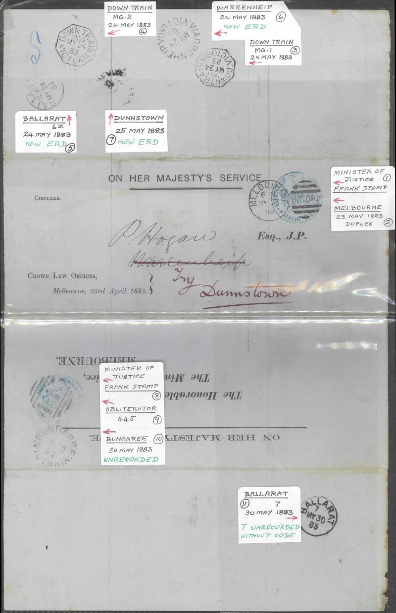 1874-84 Justice of the Peace 'turned' lettersheets & a couple of other items each with one or more manuscript endorsements mostly simple "Not known" but also "Gone Away", etc, some postmark interest, condition rather mixed (19); also 1874 outer portion with rare 'CAMPASPE' (faint but evident) & 'CLARE INN' cds, 1883 form with rare 'BUNGAREE' and ERDs for 'DUNNSTOWN' (poor) & 'WARRENHEIP'; also a range of Barred Numerals including at least five rated RRR, but the strikes are generally poor to good only.