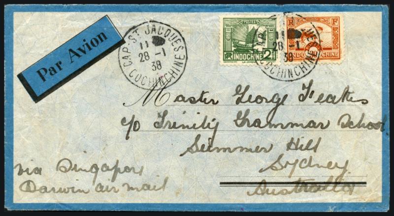 FRENCH INDO-CHINA: 1938 cover to Australia endorsed "via Singapore Darwin Air Mail" with Junk 2c & Rice 30c tied by 'CAP ST JACQUES/28-1/38/COCHIN CHINE' cds, 'SAIGON-CENTRAL' transit b/s of same day, flown to Bangkok then per Imperial Airways/Qantas to Australia with 'SUMMER HILL/9FE38/NSW' arrival backstamp, very minor blemishes. (Image1)
