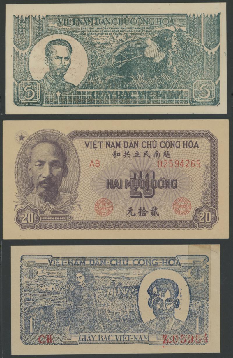 1948 1 dong P16 (tape adhered to obv.), 5 dong P17 centre fold, 100 dong purple Pick 28a Without Watermark, serial 'LN 023 C KR 198', light creases, and 1951 20 dong P51 (unc), condition variable.