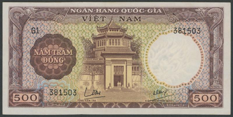 SOUTH VIETNAM: 1964-75 group comprising 1964 500 dong brown P22, 1966 100 dong brown P18, 100 dong red Pick 19b pair (light ageing), 500 dong blue P23, and 1975 (dated 1966) 5 dong Transitional Issue P42 x4, condition variable, mostly aUnc/Unc.