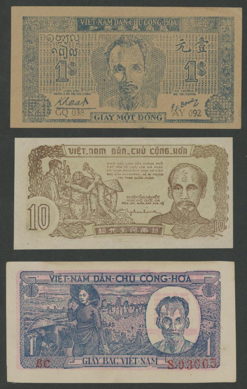 1946-1952 collection comprising 1946 5 dong P4, 1947 1d Watermark Oval P9c, 1948 1d P16, 100d Without Watermark P28a, 1951 1000d P65a, and 1952 10d Without Watermark P37b, condition variable, most aUnc/Unc.