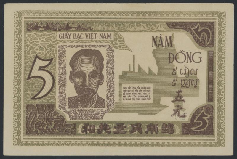 1946 5 dong P4, obv. Ho Chi Minh, rev. worker and factory, serial 'KM 045 279', Uncirculated. Not priced by Pick for Unc. (Image1)