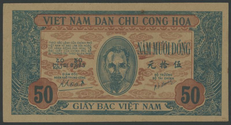 1947 50 dong Watermark VDCCCH P11b, obv. Ho Chi Minh, rev. worker and buffalo, Uncirculated. Not priced by Pick for Unc. (Image1)