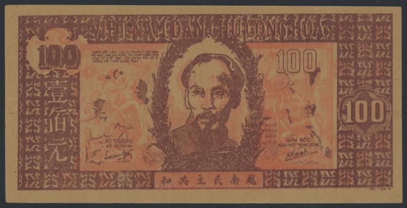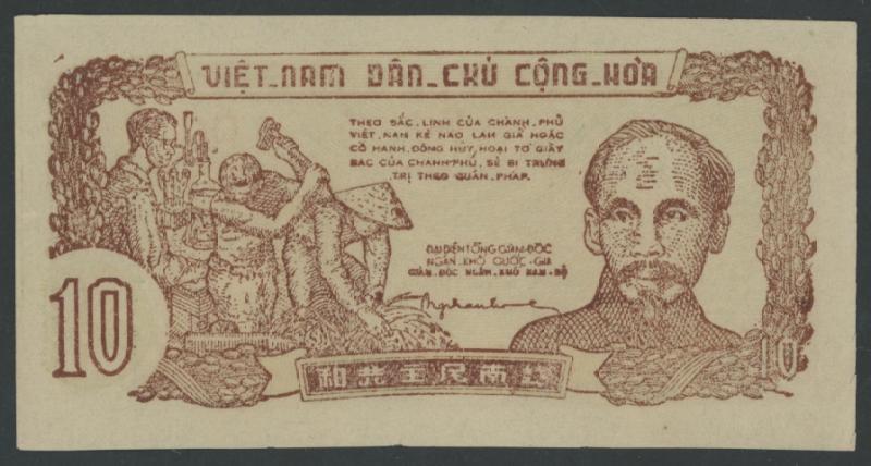 1947 1 dong Pick 9c Oval Watermark, obv. Ho Chi Minh, serial 'SW 086 CB 021', Choice Uncirculated. Not priced by Pick for Unc. (Image1)