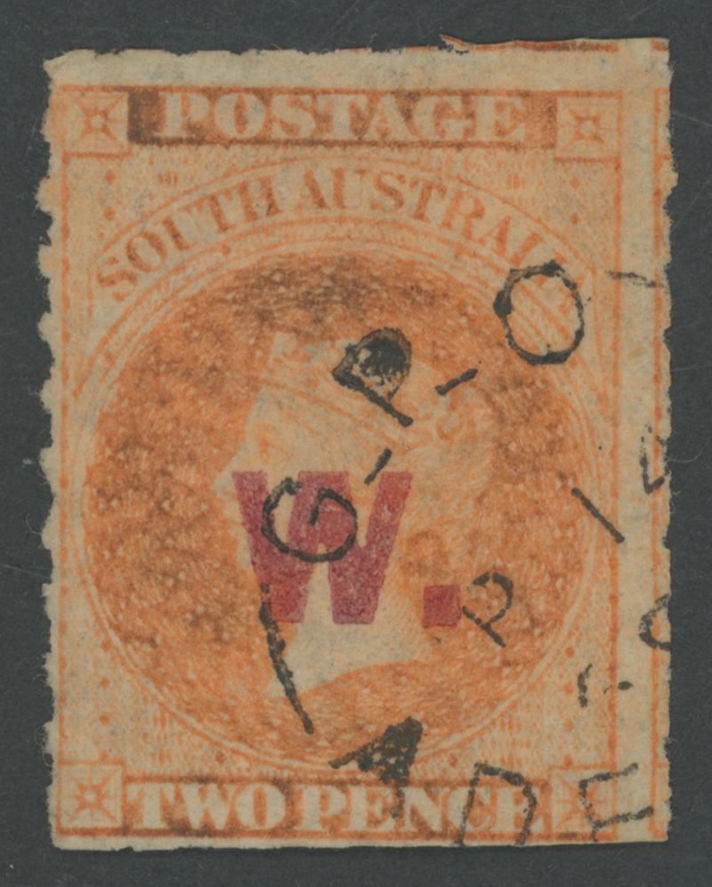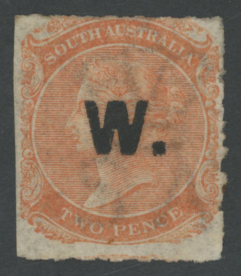BLACK OVERPRINT: 'W.' on QV De La Rue Crown/SA Wmk Rouletted 2d dull orange SG DO589, rouletting except at left where cut from the sheet clear of the design, part-gum, Cat £750. Rated RRR. Ex Baron von Ferrary, Theodore Champion and Philip Croker. Chris Ceremuga Certificate (2009) states "extremely rare". The Vestey and 'Besancon' examples sold for £780 and SFr725 respectively. (Image1)