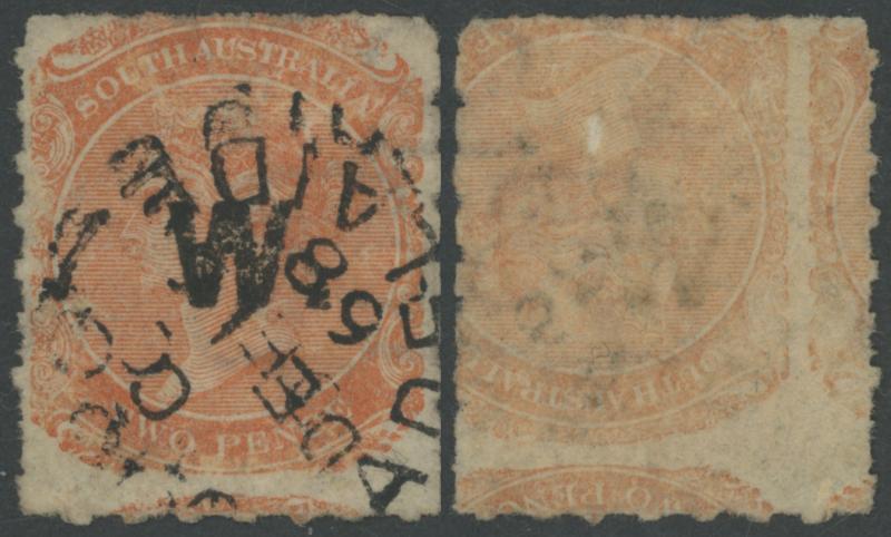 BLACK OVERPRINT: 'W.' on QV De La Rue Crown/SA Wmk Rouletted 2d dull red-orange Printed on Both Sides SG DO589a, the pale original printing on the 'reverse' showing portions of four units & Inverted Relative to the Face and consequently with the Watermark Inverted, rouletting on all sides, GPO cds of 'DE16/68'. Rated RRRR: unrecorded unused. Ex Rev James Mursell, Colonel Napier (III) and Don Pearce: sold for $1135 (Sale 247 Lot 846). Absent from all the other major collections including Gary Diffen's Errors and the only example we have recorded. [The date range including the normal stamp is 16.12.1868 to 9.9.1870] (Image1)