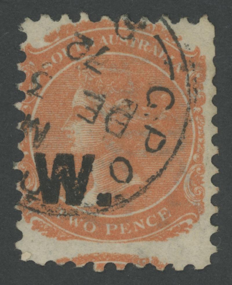 BLACK OVERPRINT: 'W.' on QV De La Rue Crown/SA Wmk Perf 10 2d deep red-orange SG DO590 (the last stamp in the Gibbons listing) with the Overprint Misplaced to Lower-Left, a few slightly trimmed perfs, fine GPO cds of 'DE3/72', Cat £200+. Underrated at S. The Les Munn and 'Sir Humphrey' (Brian Farmer) examples sold for $287 (Sale 110 Lot 920) and $310 (Sale 118 Lot 594) respectively. Don Pearce's example - also with the overprint misplaced; on piece - sold for $380 (Sale 247 Lot 847). [Date range 3.11.1870 to 22.7.1873] (Image1)