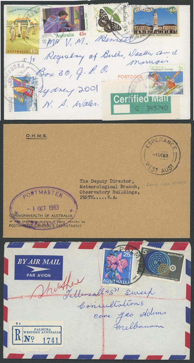 Box of mostly 1960s-1980s commercial & stampless OHMS covers from around the State, many registered from small offices notably suburban POs in milkbars, newsagencies etc, several 'PAID' cds, a few rubber types including oval 'MONEY ORDER OFFICE/FREMANTLE 6160' and 'POSTMASTER/ESPERANCE', '.../PERTH STIRLING ST 6000' and '.../WICKEPIN', etc, generally fine to very fne.