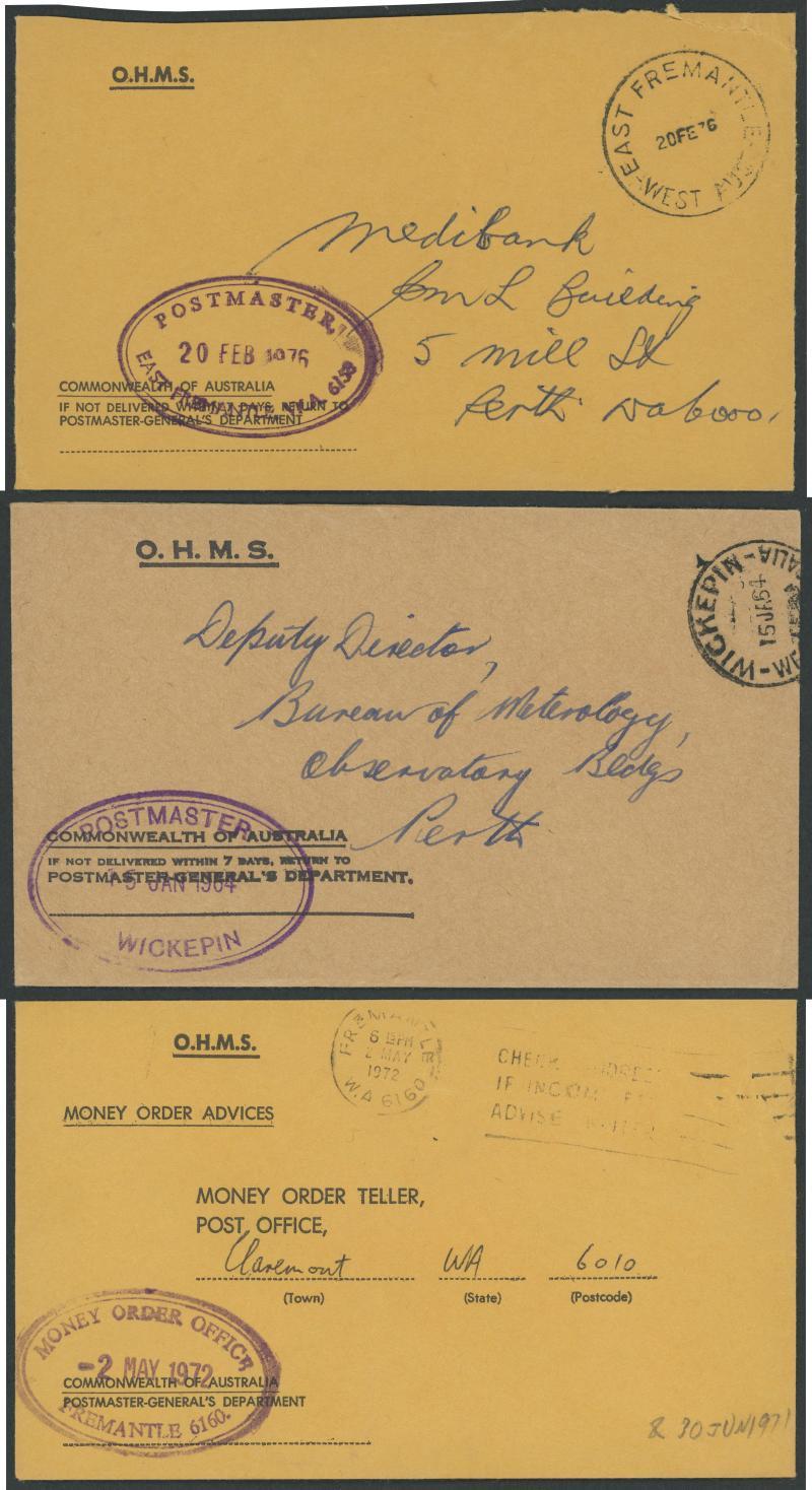OHMS stampless covers 1963-76 with all-different rubber 'POSTMASTER/...' datestamps including '.../BODDINGTON WA', '.../BUNBURY' (boxed), '.../EAST FREMANTLE 6158', '.../ESPERANCE', '.../KULIN', '.../MARGARET RIVER', '.../ONSLOW', '.../QUAIRADING', '.../WICKEPIN' etc, also oval 'MONEY ORDER OFFICE/FREMANTLE 6160', etc. A very scarce & desirable lot.