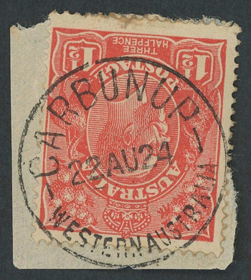 Carbunup: 'CARBUNUP/22AU24/WESTERN AUSTRALIA' cds very fine to superb complete strike on KGV 1½d red on-piece while Receiving Office only. RO 1.11.1923; renamed Jindong 1.7.1927 [Group Settlement 53; 16km SW of Busselton]. PMI records from Oct 1924; earliest recorded date. A lesser complete strike on KGV 1½d red on-piece sold at our auction of 16.6.2009 for $242 (Sale 145 Lot 161). (Image1)