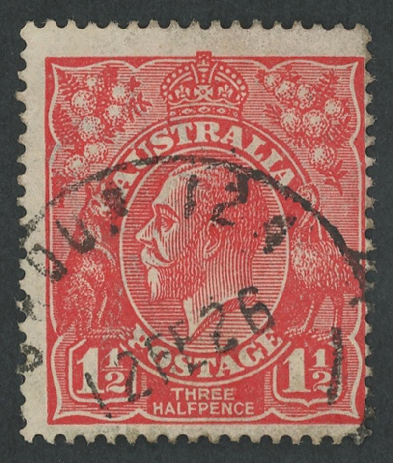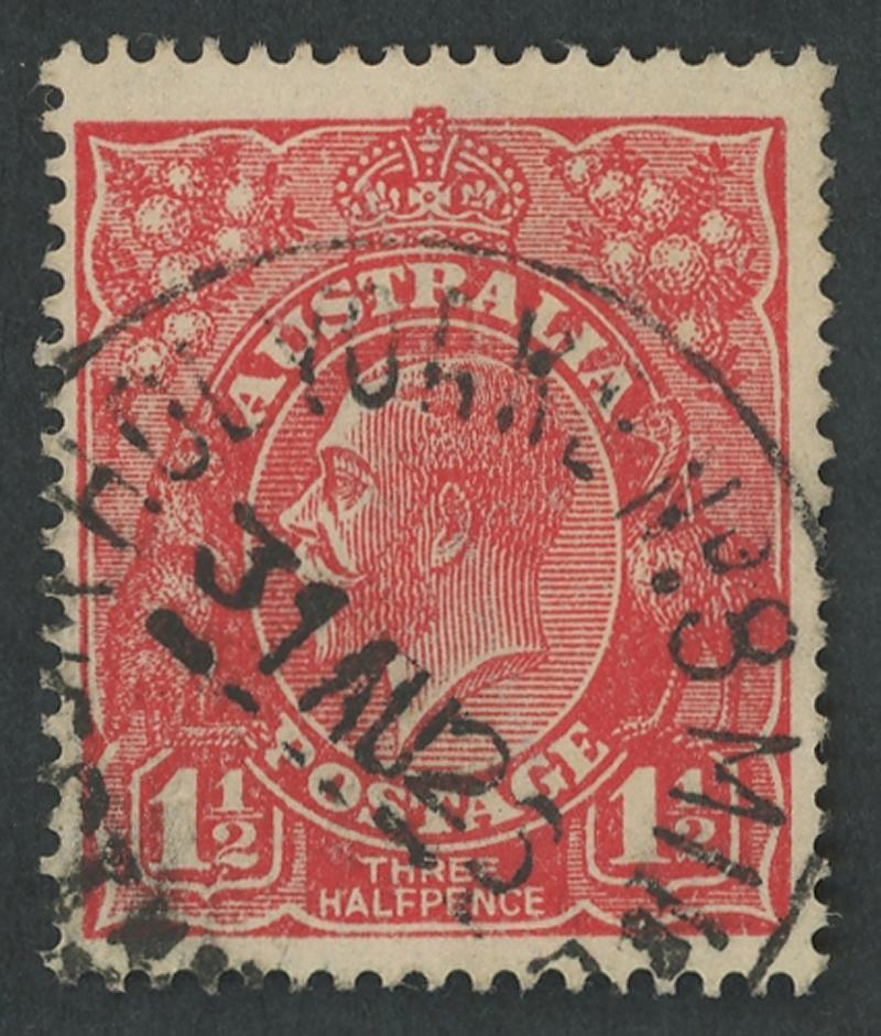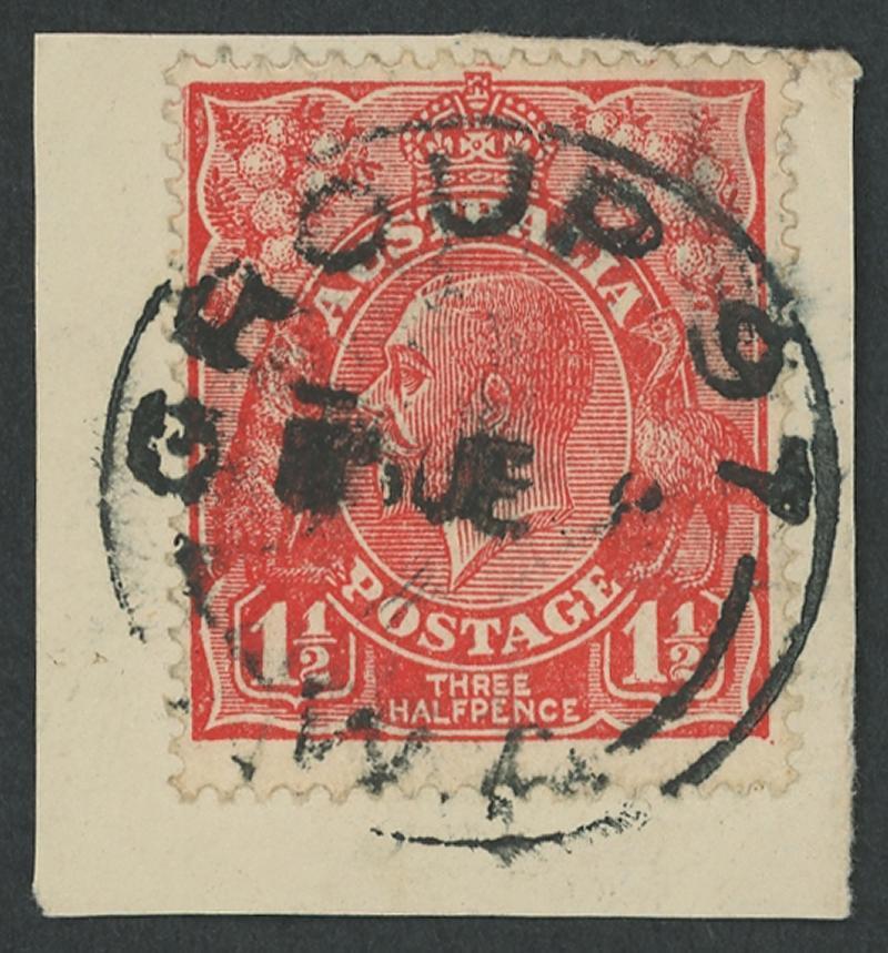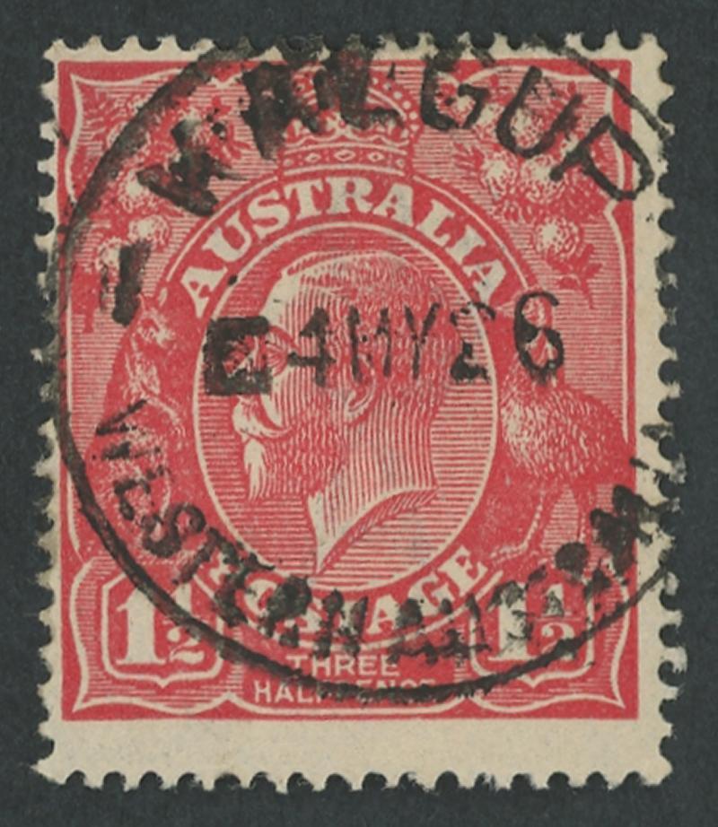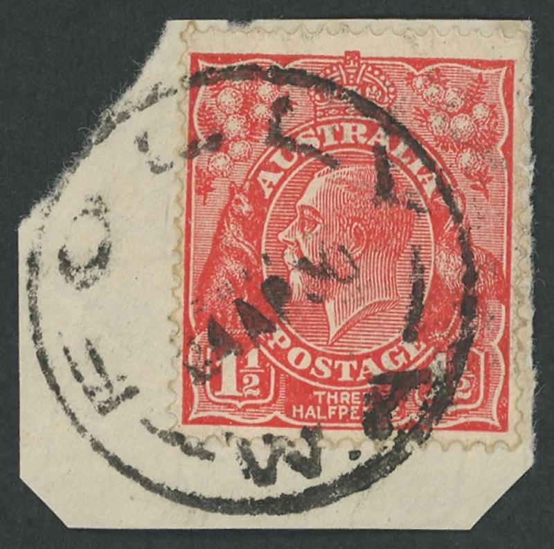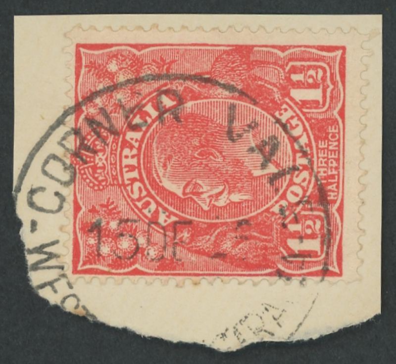 Whelarra: 'WHELARRA/-5AU25/W.A' cds largely very fine large-part strike on KGV 1½d red. Renamed from Yuna (1) PO 16.3.1925; renamed Yuna (2) 1.1.1928 [57km NNE of Geraldton]. A complete strike on KGV 1½d red on-piece sold at a Perth auction in 2021 for $414. (Image1)