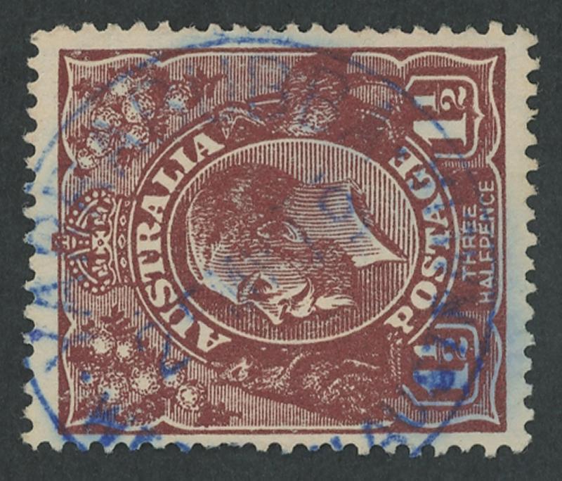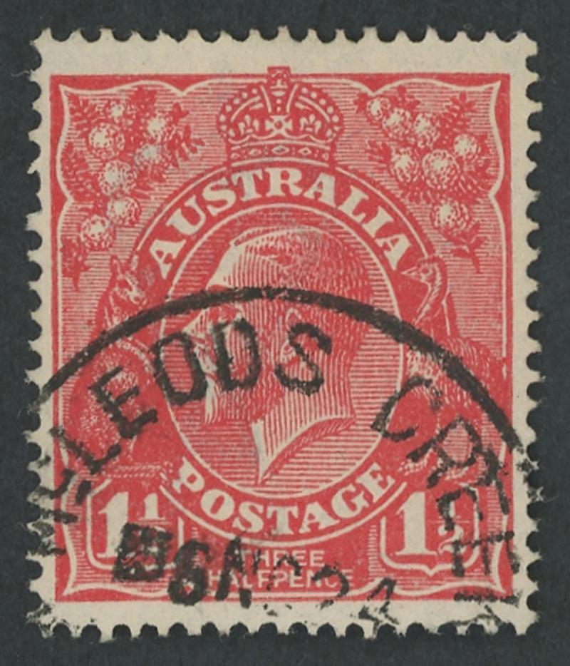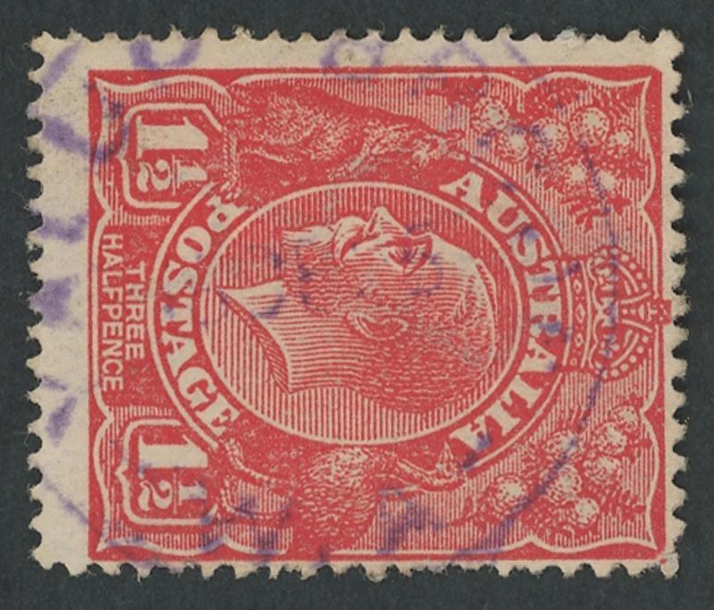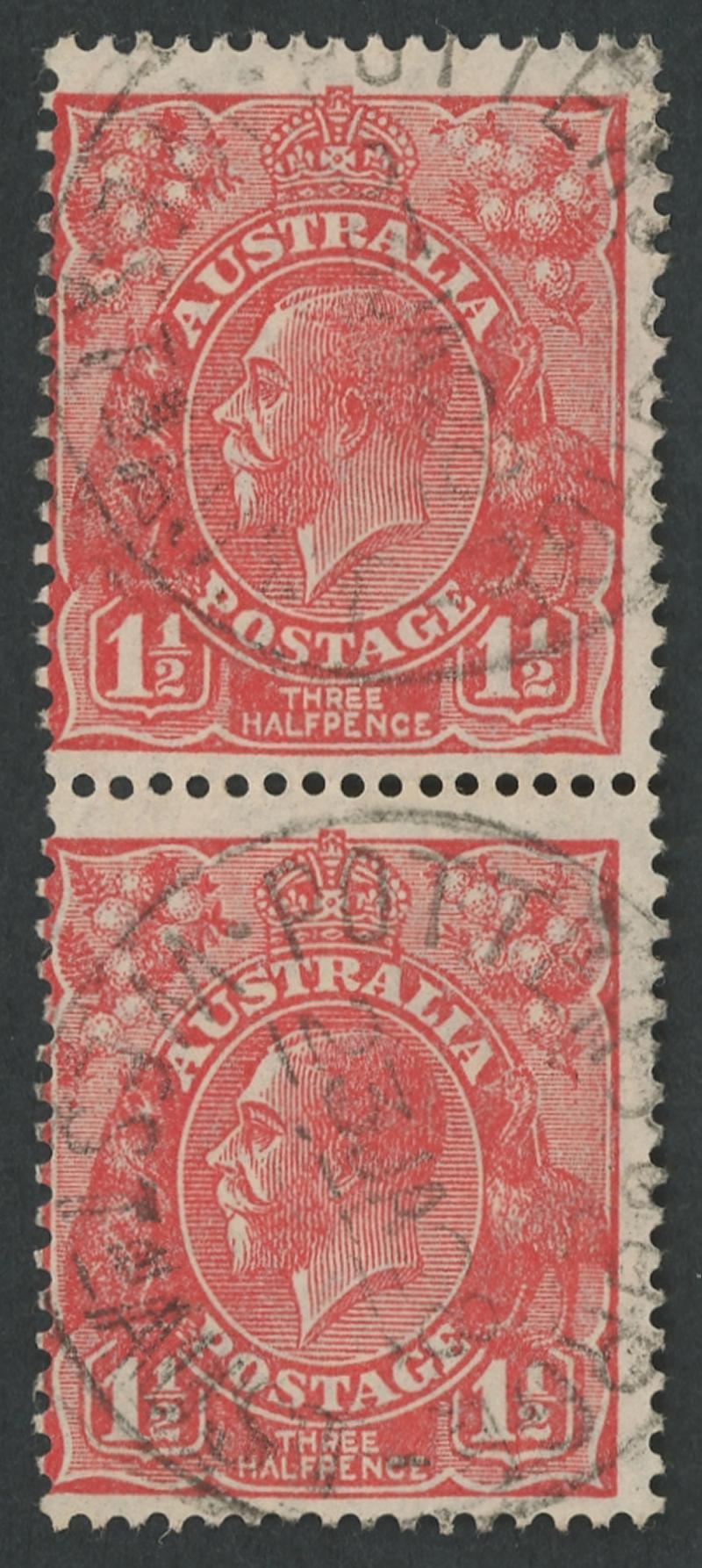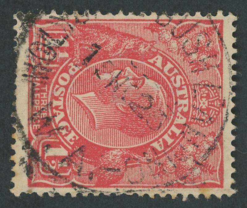Whelarra: 'WHELARRA/-5AU25/W.A' cds largely very fine large-part strike on KGV 1½d red. Renamed from Yuna (1) PO 16.3.1925; renamed Yuna (2) 1.1.1928 [57km NNE of Geraldton]. A complete strike on KGV 1½d red on-piece sold at a Perth auction in 2021 for $414. (Image1)