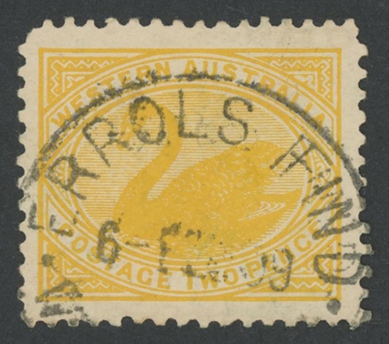 Errols Find: 'ERROLS FIND/6-FEB09/WE[STN AUSTRALIA]' cds (Type D27; dot arcs) largely very fine large-part strike on Swans 2d yellow. RO 15.10.1906; PO -.7.1908; RO -.6.1909; PO 15.1.1912; closed 30.6.1914 [Gold Mining, 80km NNW of Sandstone]. PMI records one strike of 24.12.1908 only; we have recorded other strikes of 10.9.1908 & 30.10.1910 (in violet). A slightly more complete strike sold at our auction of 26.3.2025 for $552 (Sale 259 Lot 1031). (Image1)